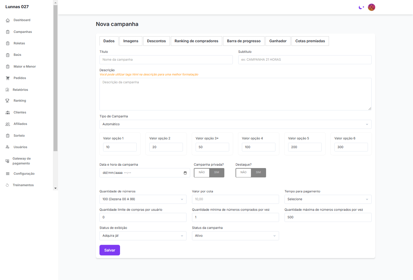 Veja que há 7 abas (menos) para você configurar cada opção: Dados - Imagens - Descontos -Ranking de compradores- Barra de progresso - Ganhador- Cotas premiadas