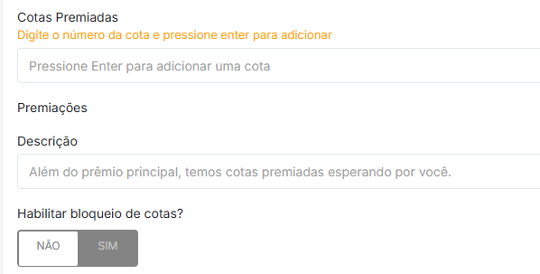 Nesta primeira opção, você irá cadastrar as cotas premiadas. Para começar, digite uma cota e pressione Enter. Em seguida, na janela que será exibida, insira o valor ou o nome do prêmio associado.